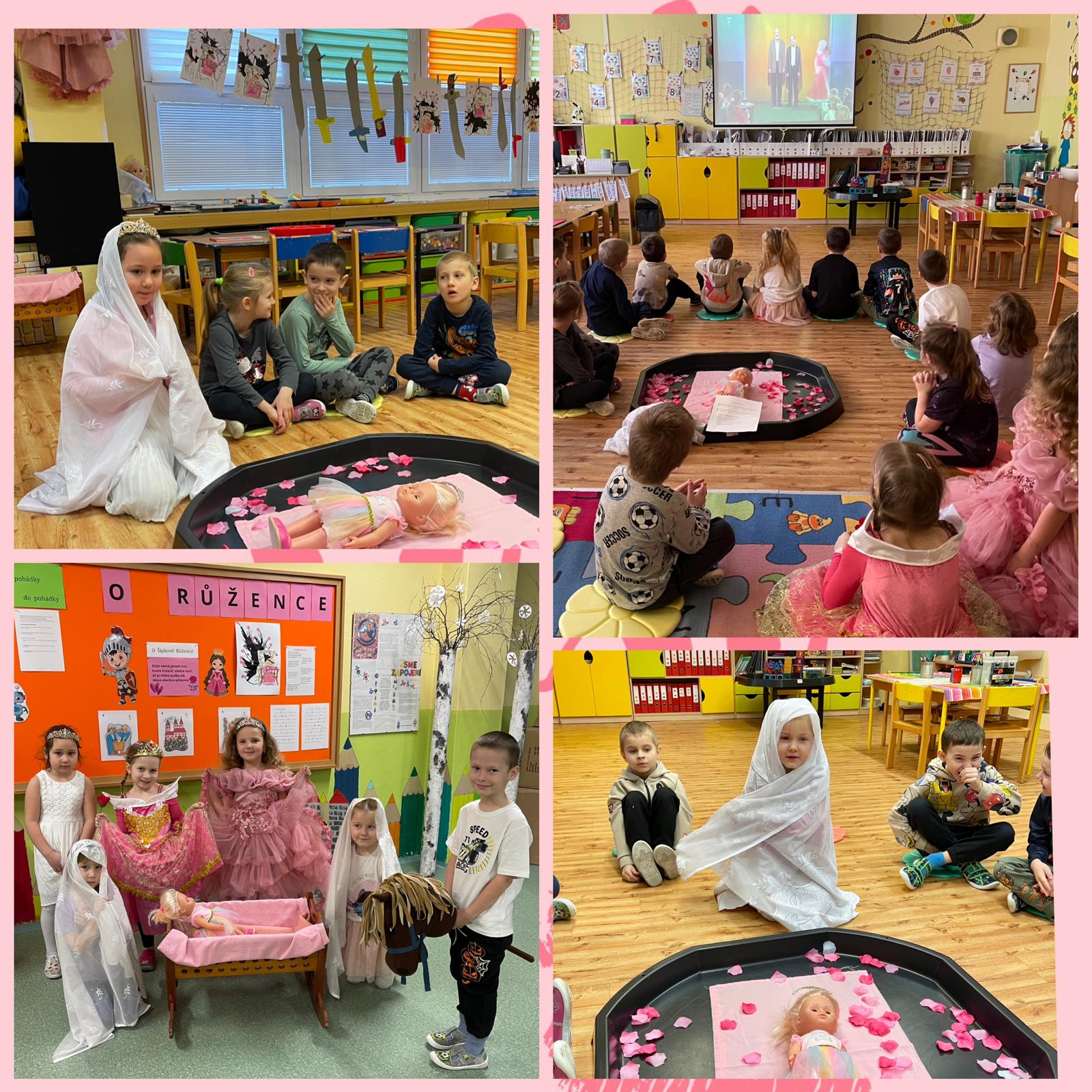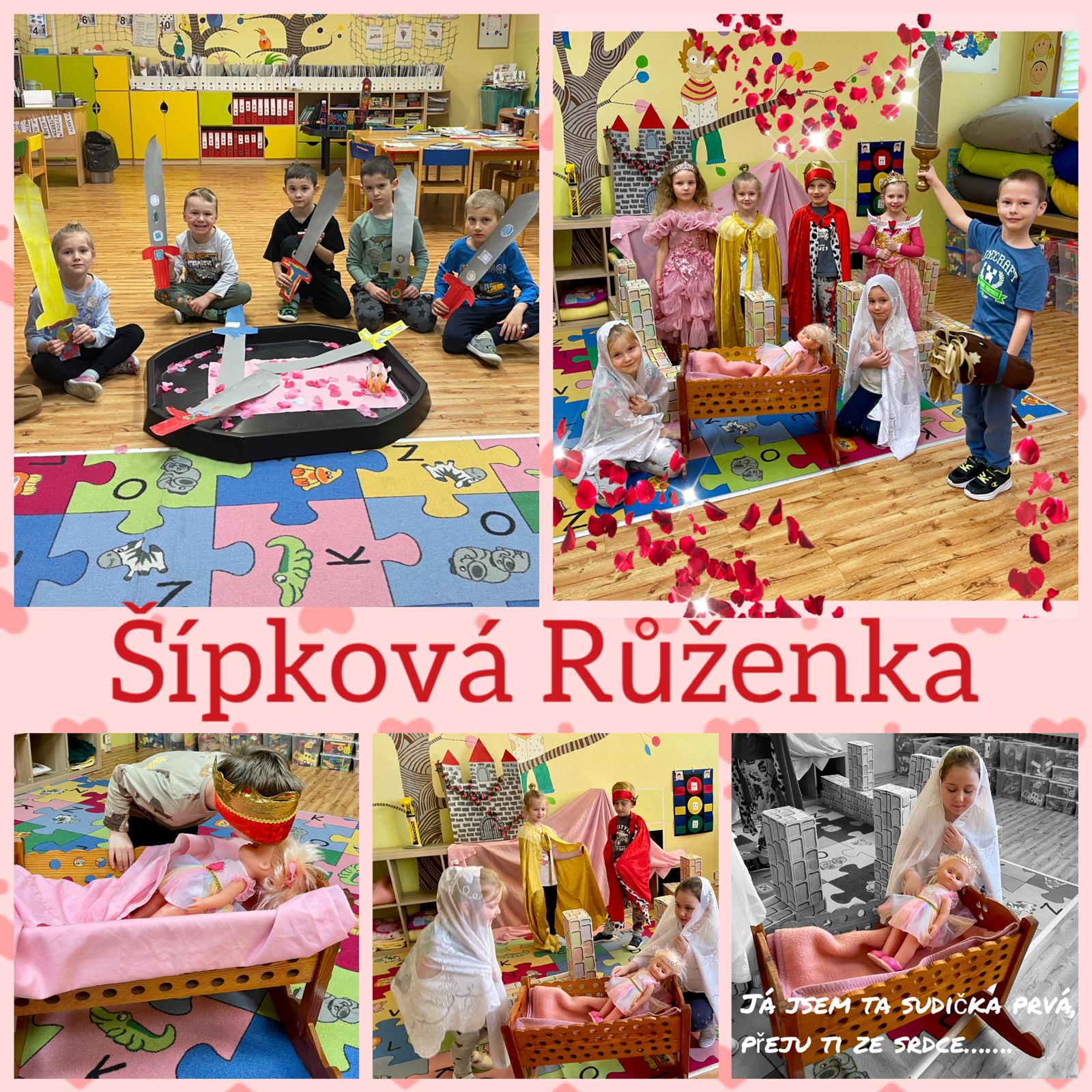 V rámci tematického bloku se děti seznámily s klasickým pohádkovým příběhem o Šípkové Růžence. Společně jsme si povídali o hlavních postavách, jejich vlastnostech a o tom, jak v pohádce vítězí dobro nad zlem. Děti pohádku zdramatizovaly – rozdělily si role princezny, prince, víl, krále, královny i zlé sudičky. Učily se vyjadřovat emoce pohybem, hlasem i mimikou a spolupracovat při společném vystoupení. Rozvíjely tak své komunikační dovednosti, odvahu vystupovat před ostatními i schopnost domluvit se v týmu. Během celého týdne si děti upevňovaly časovou posloupnost děje, rozšiřovaly slovní zásobu a učily se rozlišovat dobro a zlo. Pohádkové téma jim přineslo nejen radost z tvoření a hraní, ale také nové zkušenosti se spoluprací, trpělivostí a ohleduplností.