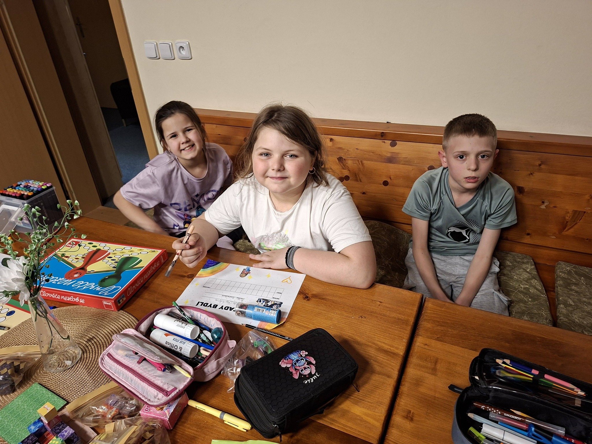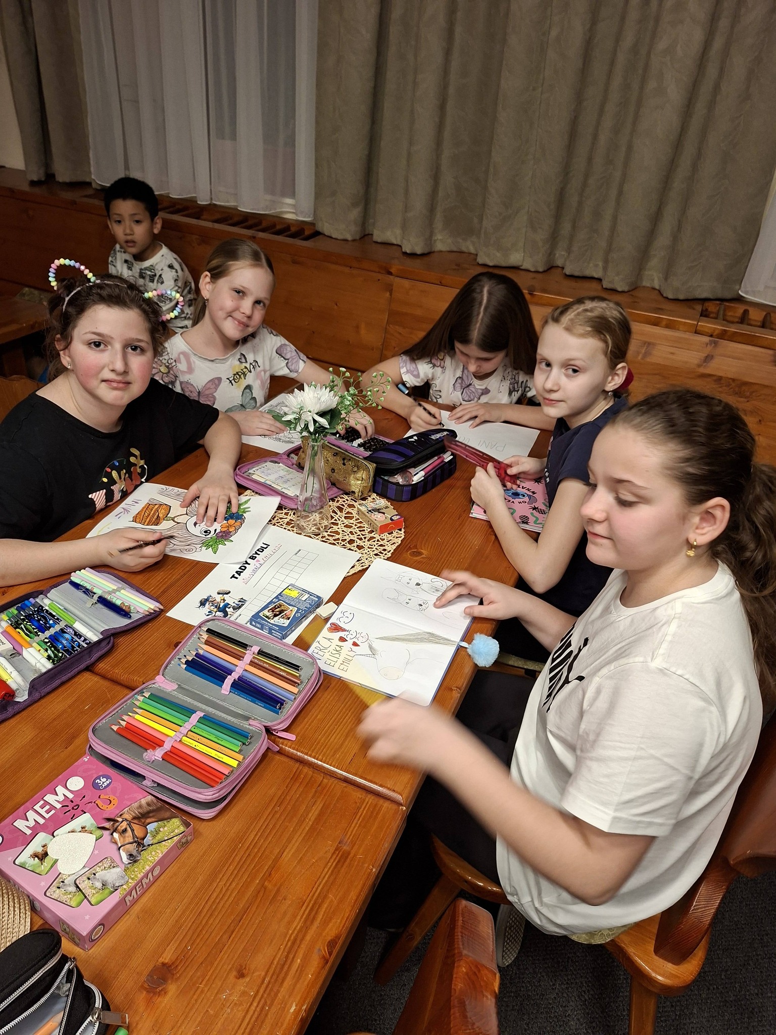 Zdravíme vás z ozdravného pobytu 4. a 5. tříd! Včera jsme se ubytovali, zašli si na večeři a vybalili kufry. Po nadepsání cedulek na dveře pokojů jsme se ponořili do hraní her a vybarvování!! Máme se moc fajn. Dnes pokračujeme!