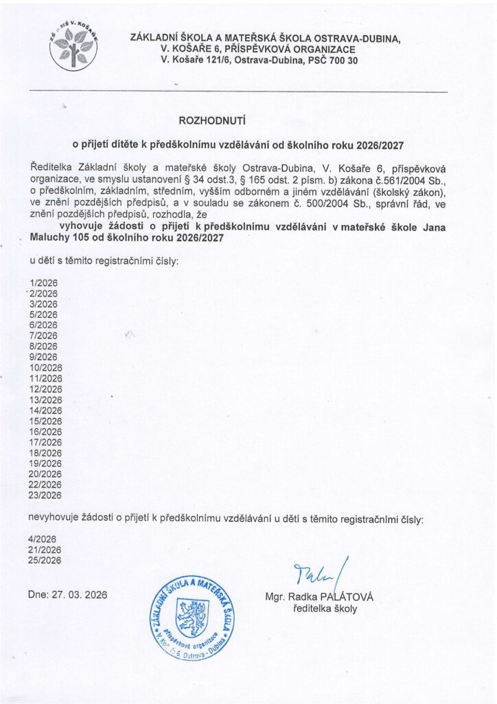 Rozhodnutí o přijetí k předškolnímu vzdělávání 2026/2027
