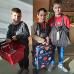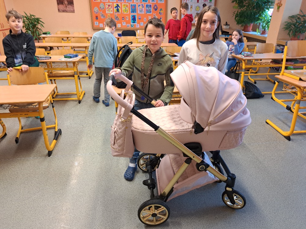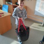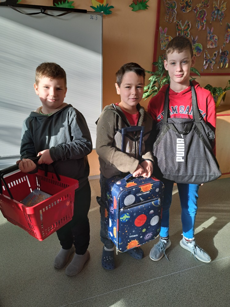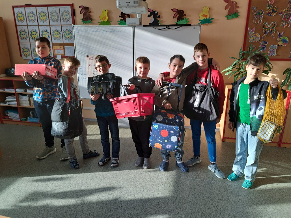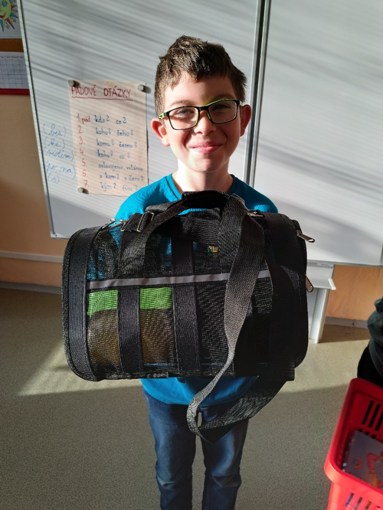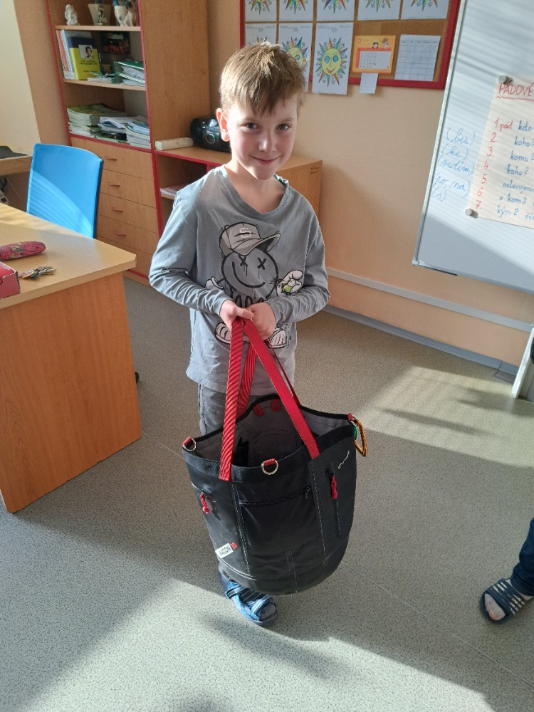 Den bez aktovek byl plný překvapivých nápadů – nejvíc nás pobavil Vláďa, který si učení přivezl v kočárku. Dále jsme měli přepravku na zvířátko, horolezecký batoh, kufr, obal od polštáře, nákupní košíky, zajímavé tašky, krabici od bot…